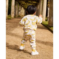 Bløde bukser i økologisk bomuld til de mindste. Bukserne har elastik og bindebånd i taljen samt ribkanter ved benene. De er nemme at tage af og på og giver masser af bevægelsesfrihed. Denne style har en ubørstet inderside, hvilket gør den dejlig kølig på en varm dag. Bukserne er beige med bananprint. Kombinér med matchende sweatshirt for et komplet outfit.