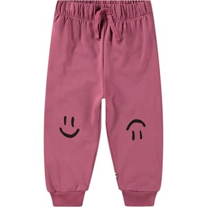 Rosa sweatpants til de mindste lavet af økologisk bomuld med en børstet inderside, der gør dem dejligt bløde og varme at have på. Bukserne har elastik og bindebånd i taljen samt ribkanter ved benene. De er nemme at tage af og på, har masser af plads til bevægelse og har små smil i sort printet på knæene.