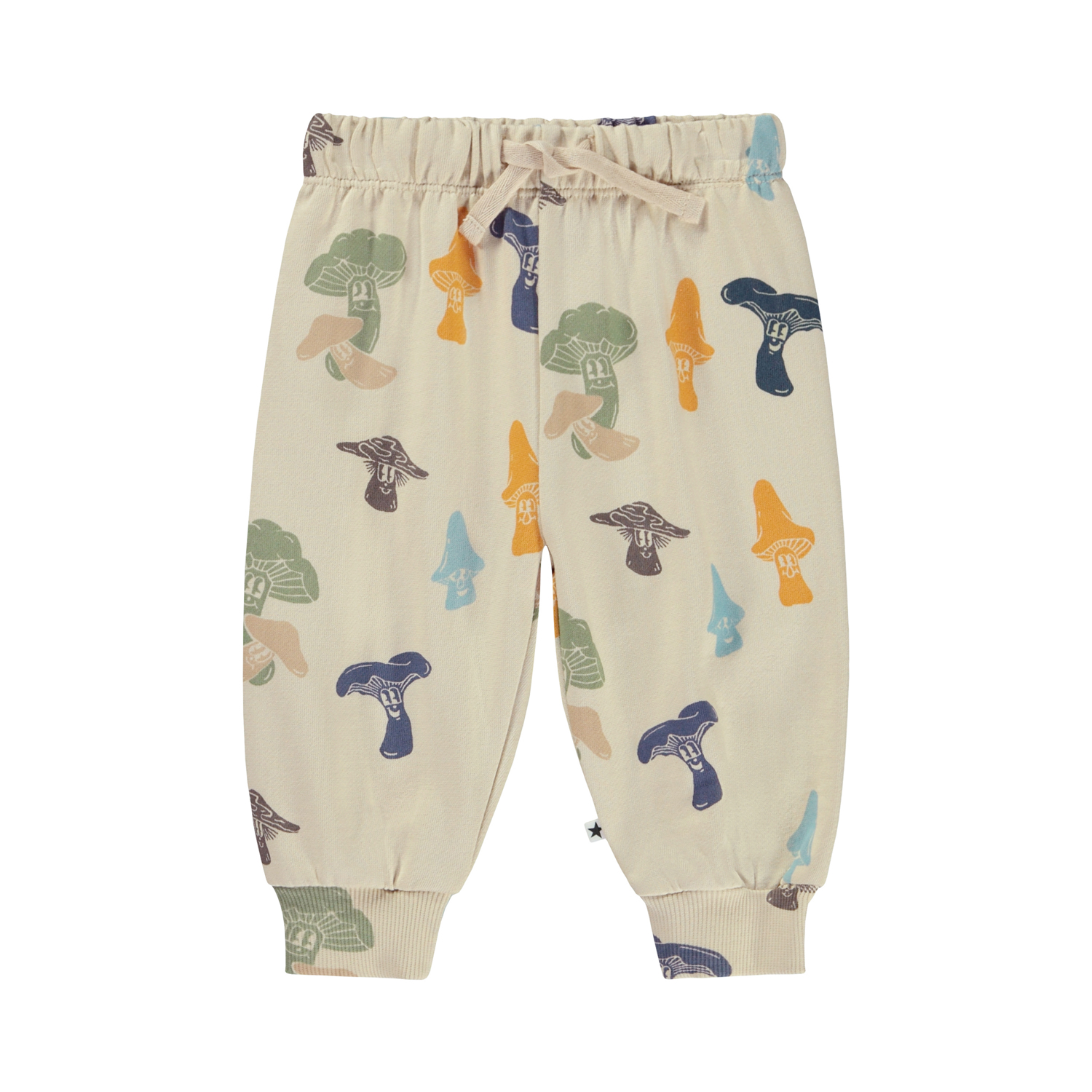Råhvide bukser i allover print til de mindste. Printet består af søde små håndtegnede cartoon svampe, i forskellige farver. Disse bukser er fremstillet i 100% bomuld, har elastik og bindebånd i taljen og rib ved fødderne. Match evt. bukserne med trøjen, Disc, i samme print for det perfekte sæt.