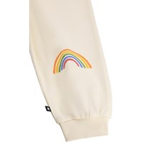 Cremefarvede bukser med regnbueprint på knæene i økologisk bomuld til de mindste. Bløde og behagelige med elastik og bindebånd i taljen, ribkanter ved benene og en ubørstet inderside.