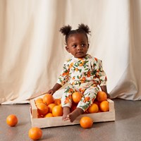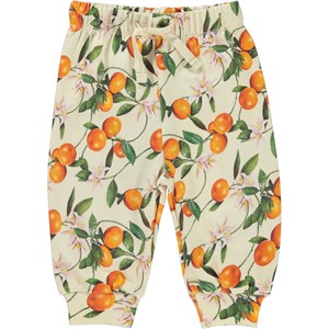 Simeon er et par lyse baby sweatpants med print mandariner. Bukserne har elastisks talje med bindebånd.