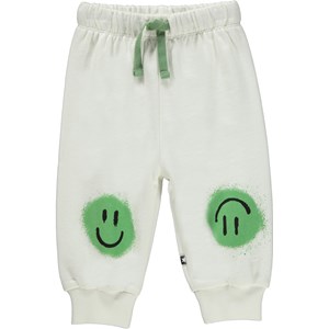 Simeon er et par hvide baby sweatpants med print af grønne smileyer på benene. Bukserne har elastisk talje med bindebånd.