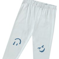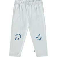 Bukser i økologisk bomuldsjersey til de mindste. Tætsiddende pasform med elastisk talje. Bukserne er lyseblå med print af smilende ansigter på knæene.