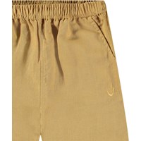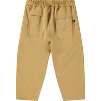 Bukser i økologisk bomuld til de mindste. Bukserne har en løs pasform, for- og baglommer samt en elastisk talje, der gør dem nemme at tage af og på. Lette og luftige. Bukserne er brune med et lille broderet smilende ansigt ved lommen. Kombiner med en matchende skjorte for et fuldendt look.
