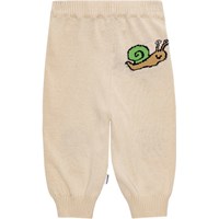 Sandfarvet bløde strikbukser i økologisk bomuld. Bukserne har en elastik i taljen, ribkanter i buksebenet og talje samt masser af plads til bevægelse. Bukserne har strikket søde mariehøns på knæene samt en snegl bagpå. Denne style kan også købes som et komplet sæt med matchende cardigan.