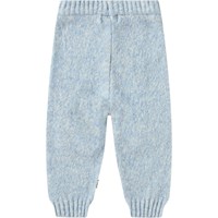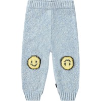Blåmelange strikbukser i blød uldblanding til de mindste. Bukserne har rib ved talje og ben samt smilende ansigter i gul på knæene.