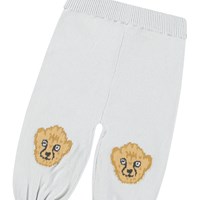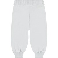 Strikbukser i økologisk bomuld til de mindste. Bukserne har rib ved talje og ben, hvilket sikrer en behagelig pasform. Strikket i lyseblå og dekoreret med søde gepardunger på knæene. Kombiner med den matchende strik for et fuldendt look.