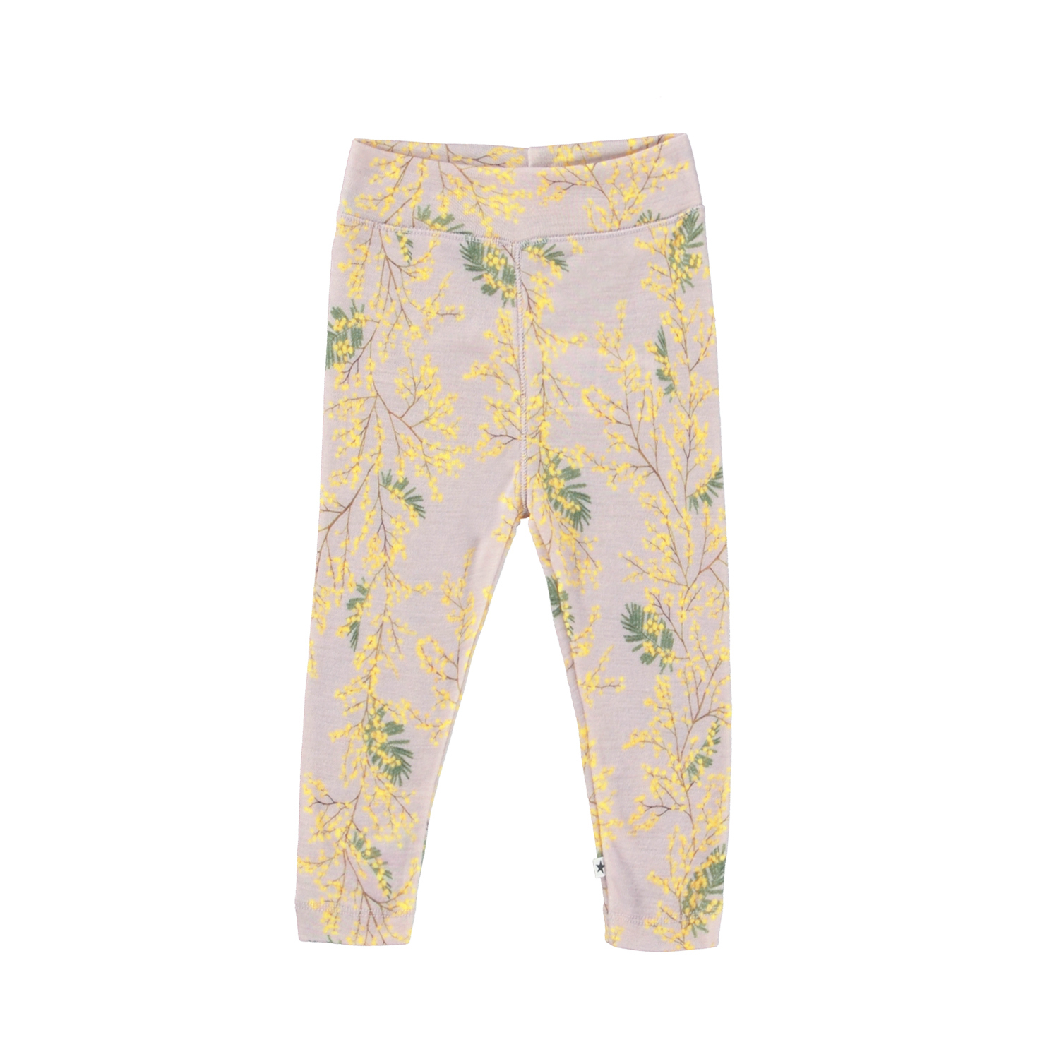 Lys lilla leggings i uld til de mindste, med allover print. På printet ses de fineste gule mimosa blomsterrænker. Disse leggings er fremstillet i 100% Merino uld. Match evt. disse leggings med blusen, Eli, i samme print for det perfekte sæt.