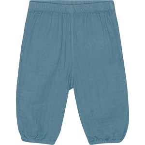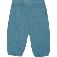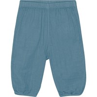 Sun er et par luftige bomulds babybukser i blå. Bukserne har en elastisk talje.