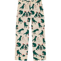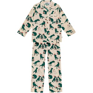 Beige og grønt pyjamas-sæt i økologisk bomuld. Bukserne har lange ben og elastisk talje med bindebånd. Toppen har lange ærmer, krave, en brystlomme og knapper ned langs fronten. Sættet har alloverprint og en almindelig pasform. Printet består af dinoer, der leger i sneen.