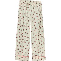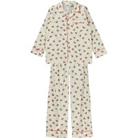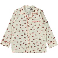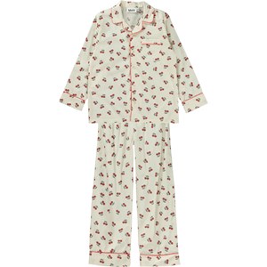 Lexi er et nattøjssæt i hvid med print af små glade kirsebær. Skjorten har lange ærmer med knappelukning på fronten. Bukserne har elastisk talje med bindebånd.