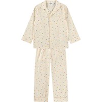 Beige todelt pyjamas i blød, økologisk bomuld med lange ærmer og ben. Skjorten har en brystlomme, krave og knapper, og shortsene har elastik og snøre i taljen. Sættet er dekoreret med et farverigt print af små hjerter.
