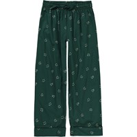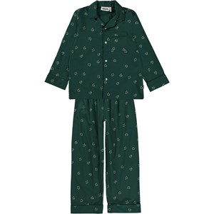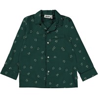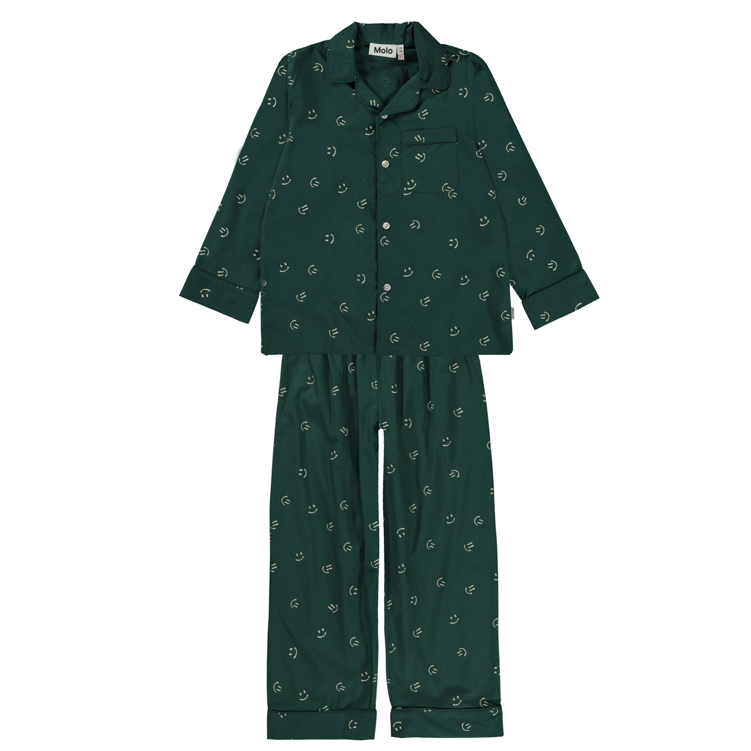 Mørkegrønt pyjamassæt med mintgrønt allover print. Printet består af en masse små smilende ansigter, der alle smiler til dig og ønsker dig en god nats søvn. Dette sæt er fremstillet i 100% bomuld. Pyjamasbukserne har elastik og bindebånd i taljen, samt opsmøg, mens pyjamasskjorten har knaplukning på fronten, en brystlomme og bånd i kanterne, der giver en flot finish.