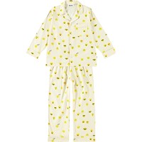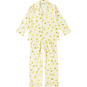 Lyst pyjamas-sæt i økologisk bomuld med lange bukseben og elastisk talje med bindebånd. Toppen har lange ærmer, krave, en brystlomme og knapper ned langs fronten. Sættet har et alloverprint af søde, gule pixel emojis og har en almindelig pasform.