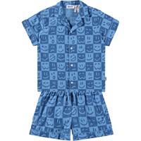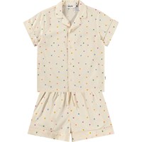 Beige todelt pyjamas i blød, økologisk bomuld med korte ærmer og ben. Skjorten har krave og knapper, og shortsene har elastik og snøre i taljen. Sættet er dekoreret med et farverigt print af små hjerter.