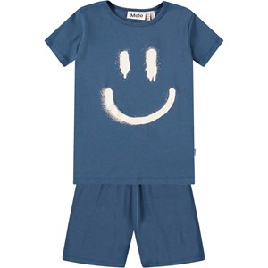 Blåt nattøj med korte ærmer og ben i strækbart økologisk bomuld. Sættet er todelt og består af en løs t-shirt med rund hals samt et par shorts med elastik i taljen, der gør dem behagelige at have på. Sættet har et smilende hvidt ansigt på fronten.