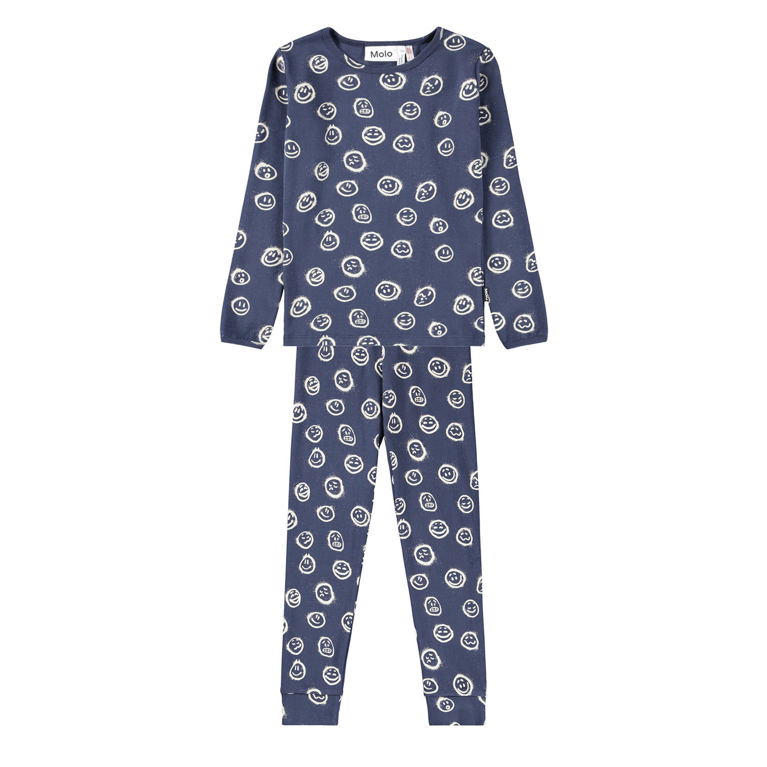 Mørkeblåt nattøjssæt i økologisk bomuld. Bukserne har elastisk talje og ribkant ved anklerne. Toppen har en rund halsudskæring. Sættet har hvidt print af ansigter i forskelligt humør.