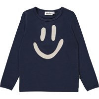 To delt nattøjssæt i mørkeblå med print af smiley på blusen. Bukserne har bindebånd i livet og blusen har lange ærmer.