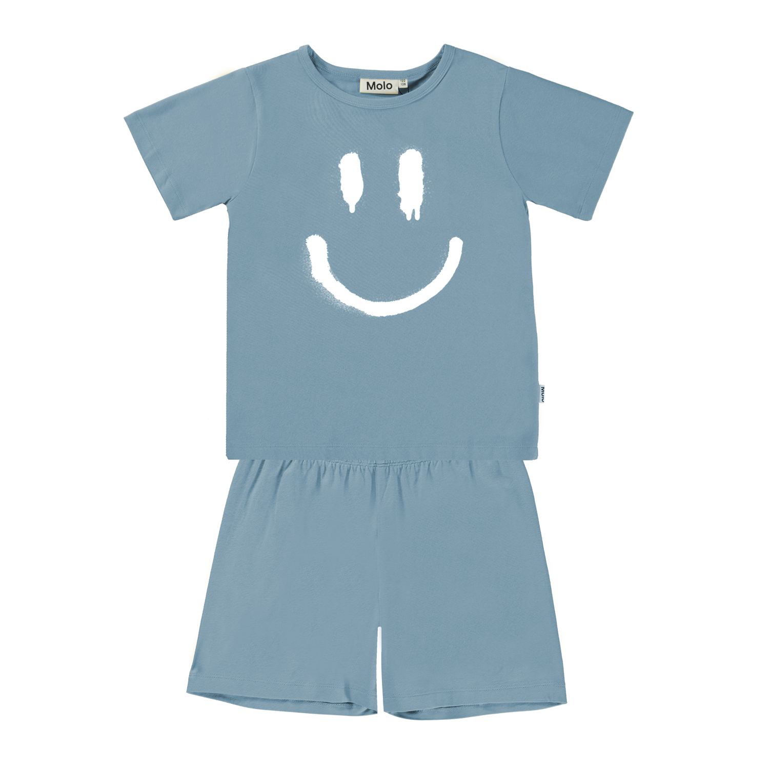 To delt nattøjssæt i blå med print af smiley på t-shirten. Shortsene har bindebånd i livet og elastisk talje.