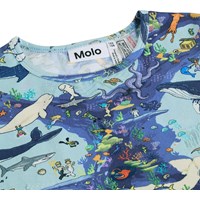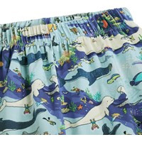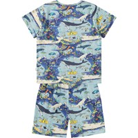 Blåt nattøj med korte ærmer og ben i strækbart, blødt økologisk bomuld. Sættet er todelt og består af en løs t-shirt med rund hals samt et par shorts med elastik i taljen, der gør dem behagelige at have på. Sættet har et pixeleret print under havets overlade af sjove fisk og fantasifulde figurer.