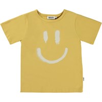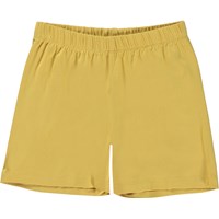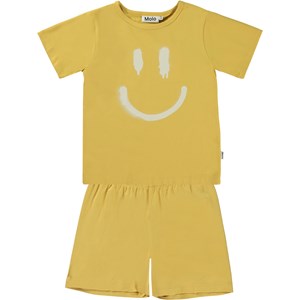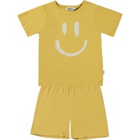 To delt nattøjssæt i sennepsgul med print af smiley på t-shirten. Shortsene har bindebånd i livet og elastisk talje.