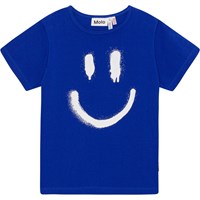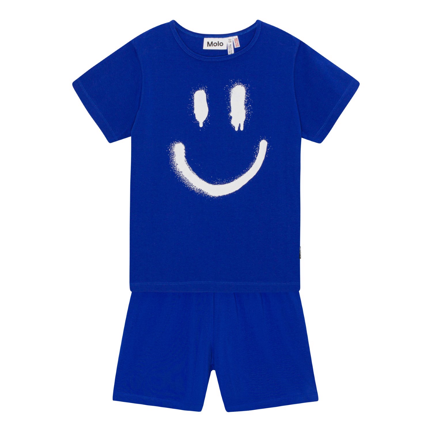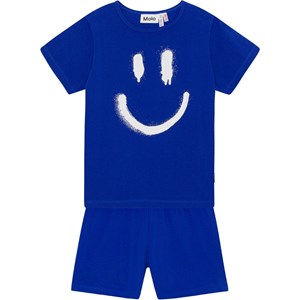 Blåt nattøj med print af et smilende ansigt og fremstillet i økologisk bomuld. Sættet er todelt og består af en løs t-shirt samt et par shorts med elastik i taljen.