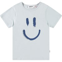 Lyseblåt nattøj med korte ærmer og ben i strækbart økologisk bomuld. Sættet er todelt og består af en løs t-shirt med rund hals samt et par shorts med elastik i taljen, der gør dem behagelige at have på. Sættet har et smilende mørkeblåt ansigt på fronten.