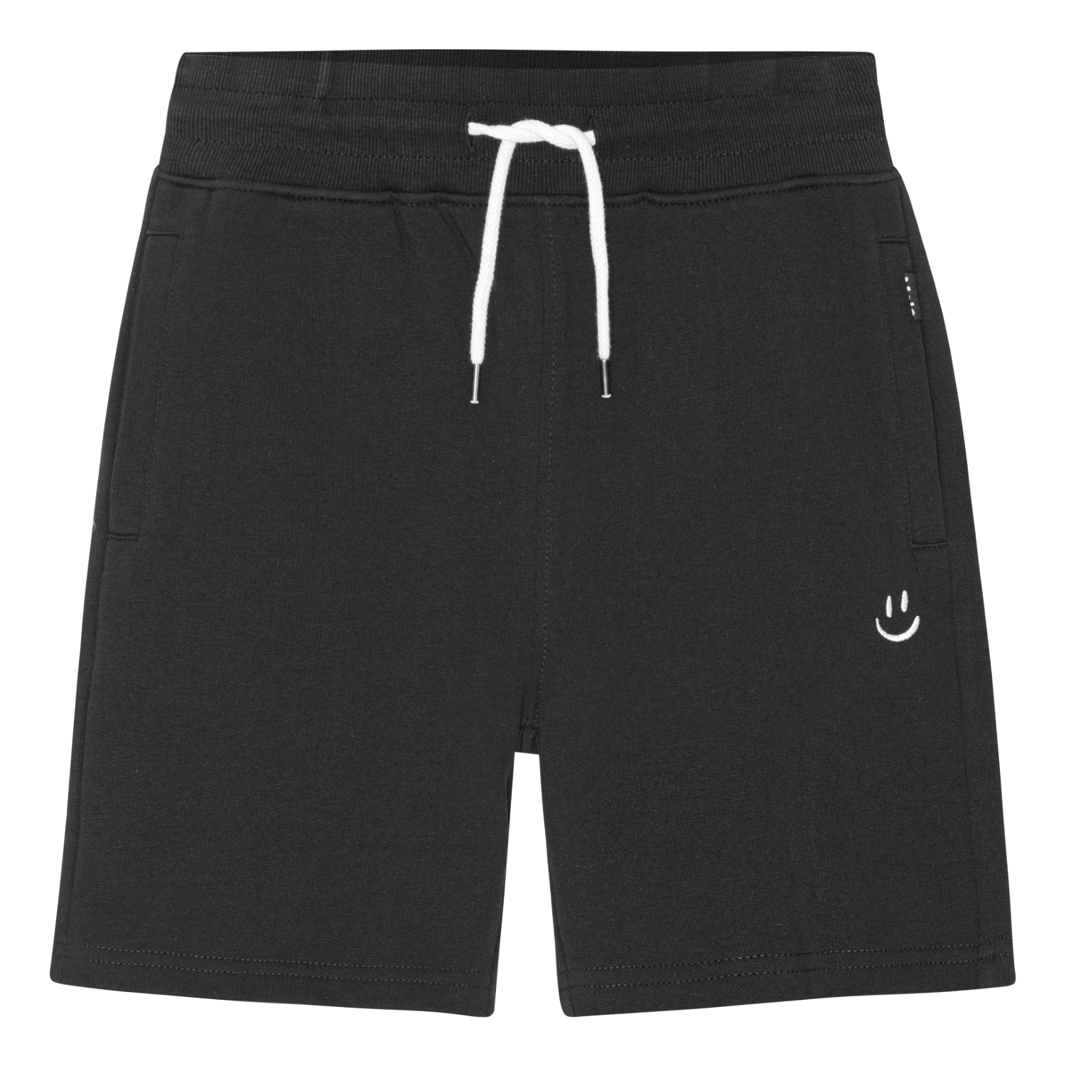 Sorte baggy shorts i blødt økologisk bomuldsjersey. Shortsene har en løs pasform med en bred elastik og snøre i taljen, det gør de nemt kan justeres samt sidder godt. Shortsene har lommer i sidesømmen og en enkelt baglomme. På fronten der broderet et lille hvidt peacetegn i hvidt som matcher snøren.