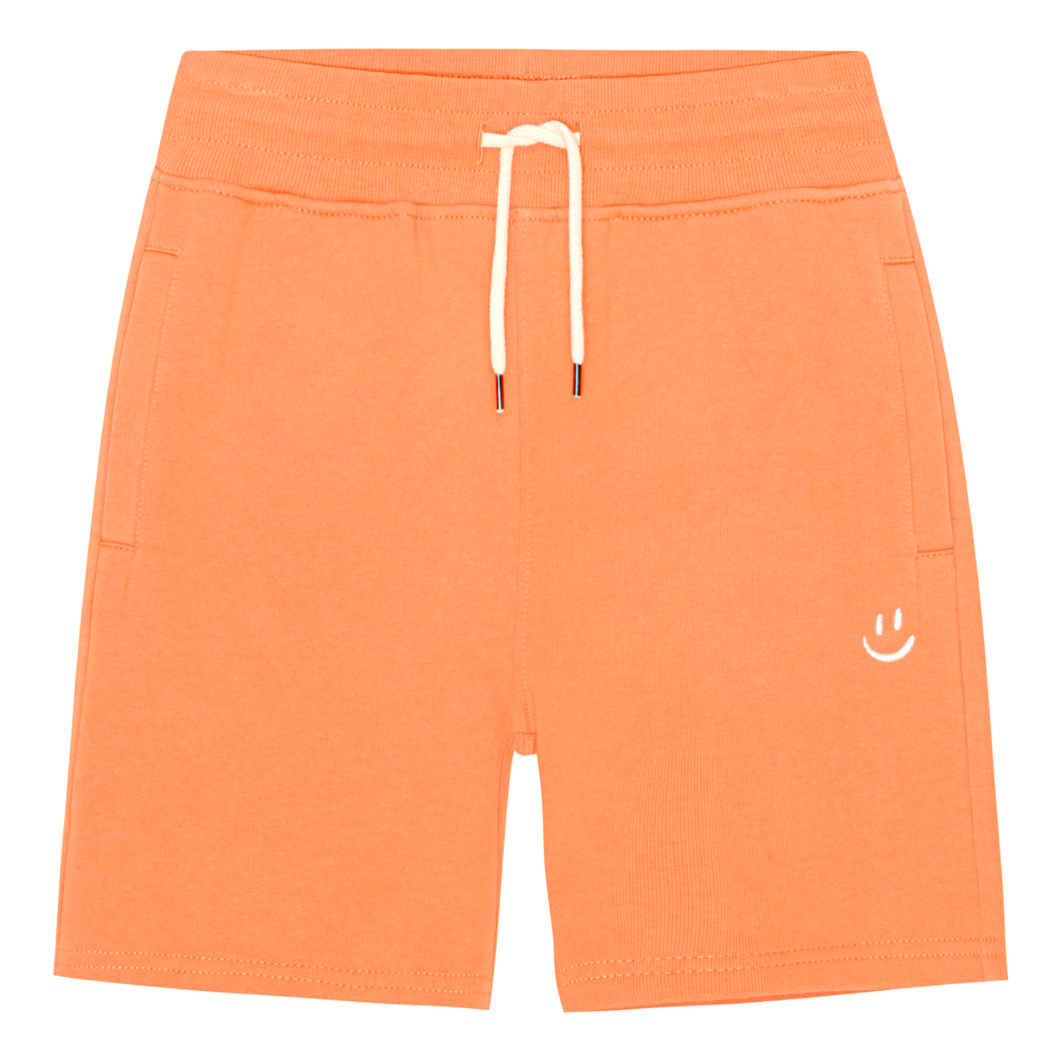 Orange baggy shorts i blødt økologisk bomuldsjersey. Shortsene har en løs pasform med en bred elastik og snøre i taljen, det gør de nemt kan justeres samt sidder godt. Shortsene har lommer i sidesømmen og en enkelt baglomme. På fronten der broderet et lille hvidt peacetegn i hvidt som matcher snøren.