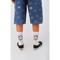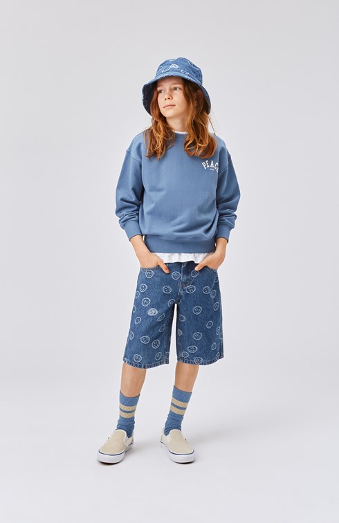 Art er et par knælange denim shorts i blå med print af fine smiley'er. Shortsene har lommer både for og bag og har en sort læderpatch med logo på bagsiden.