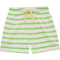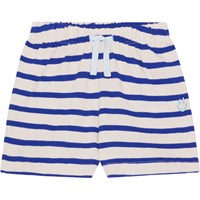 Stribet blå og sandfarvet shorts til de mindste, i blødt økologisk bomuldsjersey. Shortsene har en løs pasform med en elastik og snøre i taljen, det gør de nemt kan justeres samt sidder godt. På fronten er der broderet et lille lyseblåt smilende ansigt som matcher snøren.