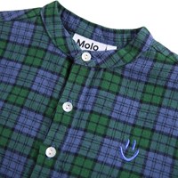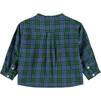 Grøn- og blåternet skjorte til de mindste i økologisk bomuld. Skjorten har kinakrave og stolpelukning med tre hvide knapper. Den løse pasform gør den behagelig at have på og nem at tage af og på. På brystet er der broderet et lille smilende ansigt i blå. Kombinér med de matchende bukser eller shorts for et komplet outfit.