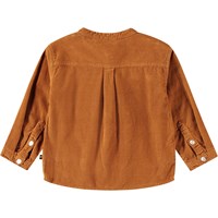 Blød, økologisk bomuldsskjorte i brændt orange til de mindste. Skjorten har en kinakrave, stolpelukning med tre hvide knapper og en løs pasform, der gør den behagelig at have på og nem at komme i. Lavet af blød riflet babyfløjl.