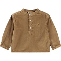 Mørkeblå fløjlsskjorte til de mindste i økologisk bomuld. Skjorten har kinakrave og stolpelukning med tre hvide knapper. Den løse pasform gør den behagelig at have på og nem at tage af og på. På brystet er der broderet et lille smilende ansigt i mørkeblå. Kombinér med de matchende bukser eller shorts for et komplet outfit.