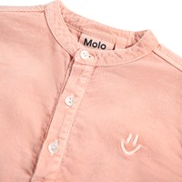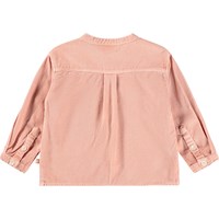 Rosa fløjlsskjorte til de mindste i økologisk bomuld. Skjorten har kinakrave og stolpelukning med tre hvide knapper. Den løse pasform gør den behagelig at have på og nem at tage af og på. På brystet er der broderet et lille smilende ansigt i rosa. Kombinér med de matchende bukser eller shorts for et komplet outfit.