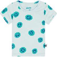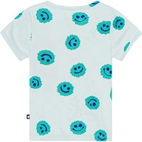 Lyseblå t-shirt til de mindste i økologisk bomulds jersey. T-shirten har en tætsiddende pasform, smalle ribkanter ved ærmer og hals samt to trykknapper på venstre skulder, der gør den nem at komme i. T-shirten har et alloverprint af turkisgrønne pomponer med mørkeblå smilende ansigter.