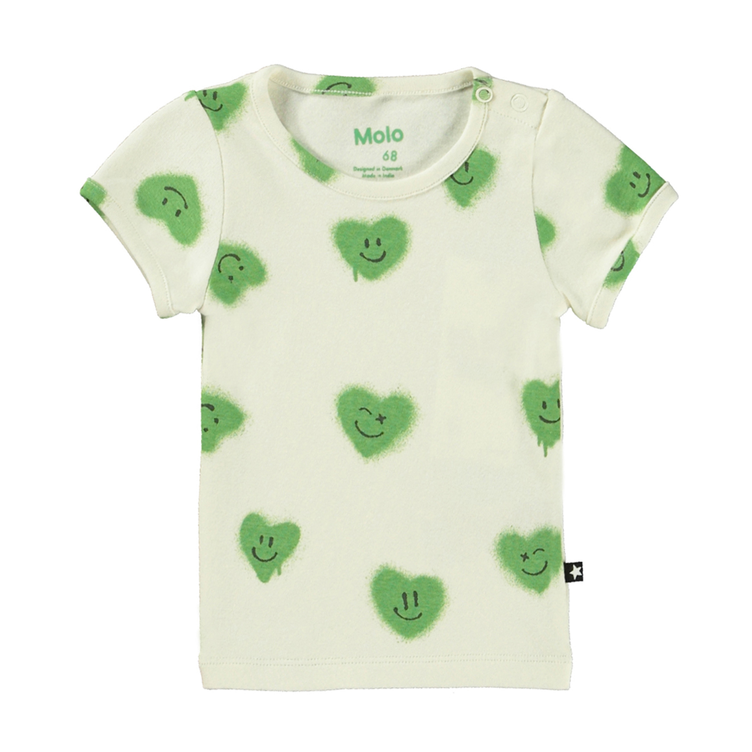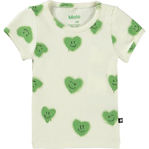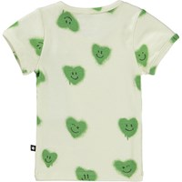 Lysegrøn t-shirt til de mindste i økologisk bomulds jersey. T-shirten har en tætsiddende pasform, smalle ribkanter ved ærmer og hals samt to trykknapper på venstre skulder, der gør den nem at komme i. T-shirten har et alloverprint af græsgrønne hjerter med smilende ansigter.