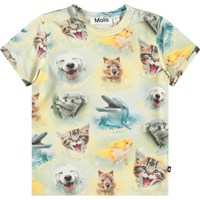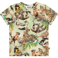 T-shirt til de mindste i økologisk bomuld. T-shirten har en tætsiddende pasform, smalle rib kanter ved ærmer og hals samt knaplukning på venstre skulder, der gør den nem at komme i. T-shirten har et allover print af glade dyr. Kombinér med de matchende bukser for et komplet outfit.