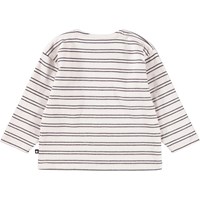 Langærmet bluse til de mindste i økologisk bomuld. Blusen har brune striber og et lille brunt smilende ansigt broderet ved brystet. Den har en løs pasform og en rund hals med knaplukning på venstre skulder, hvilket gør den nem at få af og på.