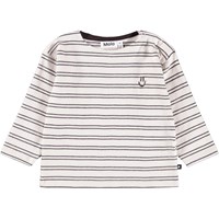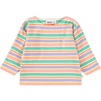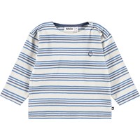Langærmet bluse til de mindste i økologisk bomuld. Blusen har multifarvede striber og et lille hvidt smilende ansigt broderet ved brystet. Den har en løs pasform og en rund hals med knaplukning på venstre skulder, hvilket gør den nem at få af og på.