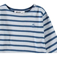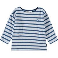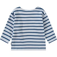 Langærmet bluse til de mindste i økologisk bomuld. Blusen har blå striber og et lille blåt smilende ansigt broderet ved brystet. Den har en løs pasform og en rund hals med knaplukning på venstre skulder, hvilket gør den nem at få af og på.