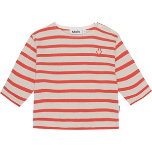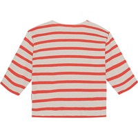 Stribet langærmet bluse til de mindste, i blødt økologisk bomuld. Blusen har en løs pasform en rund hals med to trykknapper på venstre skulder, der gør den nem at få af og på. Blusen har røde og sandfarvet striber og et lille gult smilende ansigt broderet ved brystet.