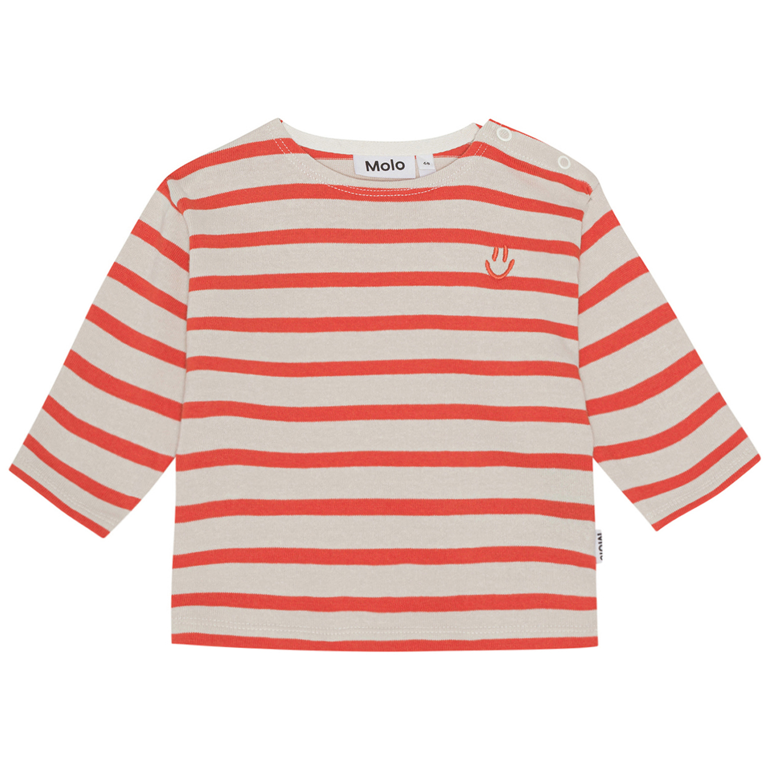 Stribet langærmet bluse til de mindste, i blødt økologisk bomuld. Blusen har en løs pasform en rund hals med to trykknapper på venstre skulder, der gør den nem at få af og på. Blusen har røde og sandfarvet striber og et lille gult smilende ansigt broderet ved brystet.