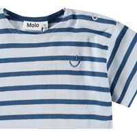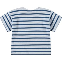 Kortærmet bluse til de mindste i økologisk bomuld. Blusen har blå striber og et lille blåt smilende ansigt broderet ved brystet. Den har en løs pasform og en rund hals med knaplukning på venstre skulder, hvilket gør den nem at få af og på.