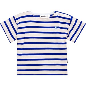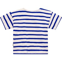 Stribet t-shirt til de mindste i blødt økologisk bomuld. T-shirten har en løs pasform, rund hals med ribkant samt to trykknapper på venstre skulder, der gør den nem at komme i. T-shirten har blå og sandfarvet striber og et lille lyseblåt smilende ansigt broderet ved brystet.