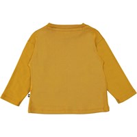 Eki er en gul babybluse med print af smiley på fronten. Blusen har knappelukning på den ene skulder.