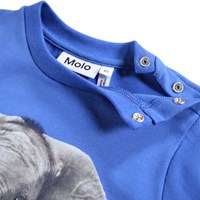 Blå bluse i økologisk bomuldsjersey til de mindste. På blusen er der et print af en babyelefant. Blusen har god bevægelighed, lange ærmer og ribkant på ærmerne. Den har også to trykknapper på venstre skulder, hvilket gør den nem at komme i.