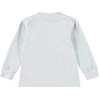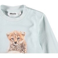 Langærmet bluse i økologisk bomuldsjersey til de mindste. Blusen har god bevægelighed, lange ærmer og ribkant på ærmerne samt knaplukning på skulderen, hvilket gør den nem at tage på. Blusen er lyseblå med print af søde gepardunger.