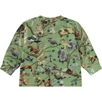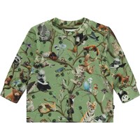 Grøn bluse til de mindste med allover print. På printet ses alverdens dyr i livets træ. De fortæller historien om hvordan vi alle i verden er forbundne. Som træernes rodnet, er svampe og fugle, træer og bjørne, store og små, forbundne og vi skal alle passe på hinanden. Denne bluse er fremstillet i 100% bomuld, har lange ærmer og trykknapper ved halsen, så den er nem at få af og på. Match evt. denne trøje med bukserne, Serene, i samme print.