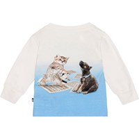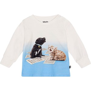 Råhvid langærmet bluse til de mindste i økologisk bomuldsjersey. Blusen har god bevægelighed, ribkant på ærmerne samt to trykknapper på venstre skulder, der gør den nem at komme i. T-shirten har et sødt frontprint med en syngende hundehvalp og en syngende kattekilling, der står på deres noder.